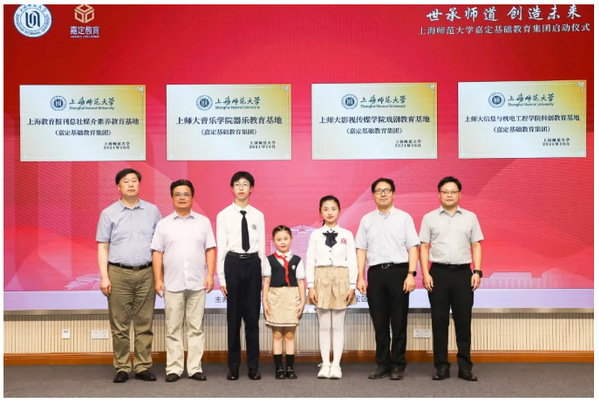 启动仪式上,上海教育报刊总社社长仲立新、上海师大音乐学院院长施忠、影视传媒学院院长赵炳翔、信息与机电工程学院院长张波携手三所校学生代表,一起为集团的器乐、戏剧、科创、媒介素养四个教育基地揭牌。