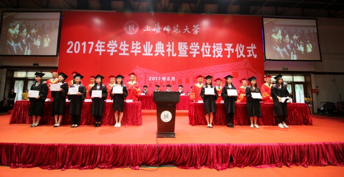 毕业典礼上,校党委书记滕建勇宣读了表彰2017届优秀毕业生决定,表彰一批上海市高等学校优秀毕业生和上海师范大学优秀毕业生,在场的校领导为获奖学生代表颁发证书。