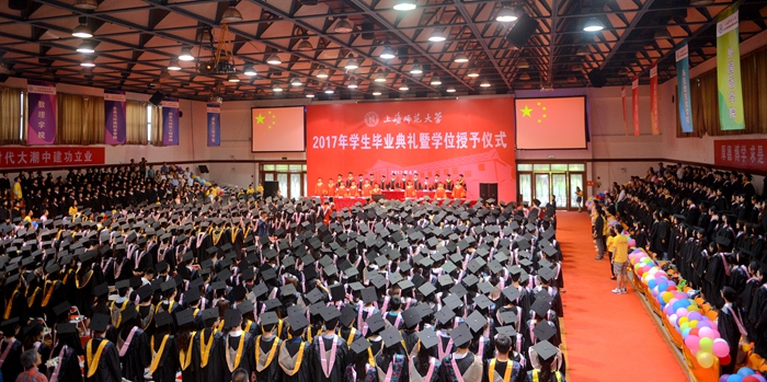6月14日上午,“传承师大精神 激扬青春梦想”上海师范大学2017届本科生毕业典礼暨学位授予仪式在徐汇校区球类馆举行。校领导、校友代表、学院领导、教师代表和家长代表,以及全体上海市高校优秀毕业生、上海师范大学优秀毕业生参加了庄重而热烈的典礼。校党委副书记、副校长葛卫华主持典礼。
