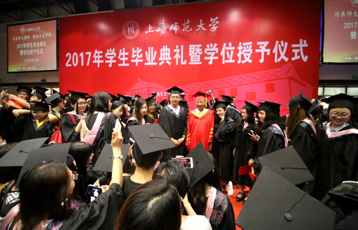 在庄严而神圣的学位授予授权仪式上,上海师范大学学位评定委员会主席、校长朱自强教授对2017届本科毕业生学位授予权进行授权。毕业生代表领誓了《青春誓词》。当“追逐梦想”的师大毕业季音乐响起时,毕业生们用最美丽的鲜花表达对老师和家长的真诚感谢,用最温暖的拥抱纪念同窗四年的青春友谊,用最快乐的笑容定格这值得铭记的时刻。