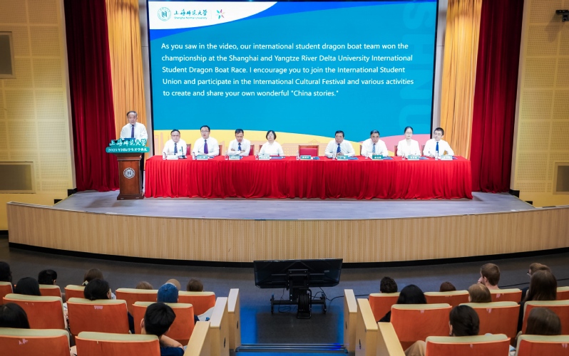 在两位学生代表发言结束后,现场播放了一段呈现上一学年国际学生的学习、生活与文化活动片段的视频。让新生对上海师范大学的课堂学习、课外实践、文化体验、志愿工作等有所了解,并且对年度国际文化节、迎新晚会和上海市国际学生龙舟赛等大型中外文化交流活动充满了期待。