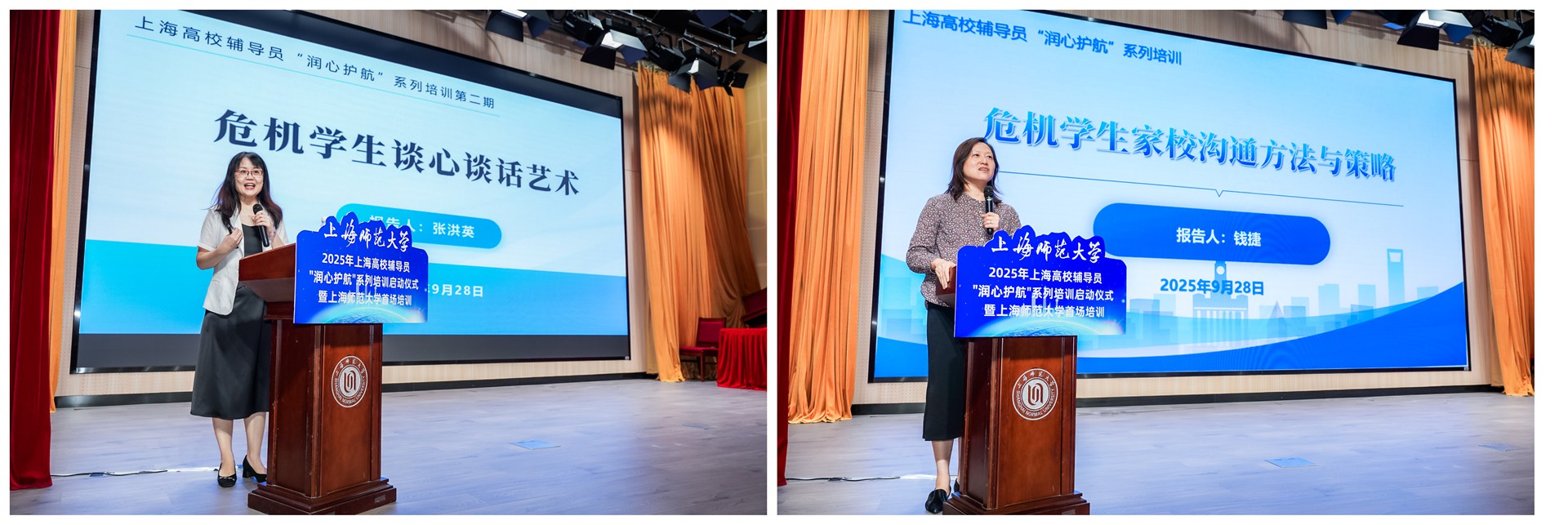 启动仪式后,2025年“润心护航”首场专题培训拉开帷幕。上海交通大学心理咨询中心主任张洪英围绕“谈心谈话艺术”主题,深入介绍“谈话五部曲”的完整流程与实操技巧;复旦大学心理健康教育中心主任钱捷聚焦“家校沟通方法”主题,深入解读沟通原则与实战策略。两位专家的授课内容翔实、案例鲜活,极具科学性、实操性与针对性。