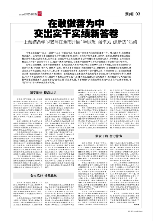 标题:在敢做善为中交出实干实绩新答卷 ——上海结合学习教育在全市开展“学思想 强作风 建新功”活动