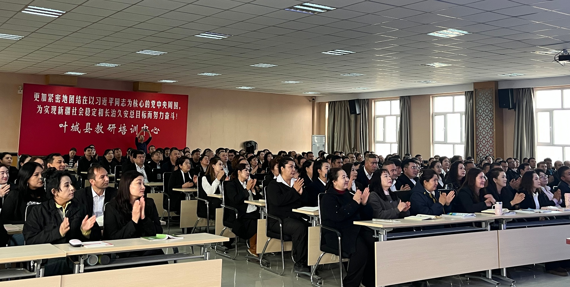 10月19日,为落实习近平总书记在新疆维吾尔自治区成立70周年庆祝大会讲话精神,学校传承教育援疆、文化润疆的优良传统,发挥学校教师教育特色和国家语言文字推广基地(上海师范大学)的优势,由上海师范大学继续教育学院组织申报,国家语言文字推广基地(上海师范大学)、上海师范大学对外汉语学院承办的“2025年新疆维吾尔自治区‘国培计划’——教师国家通用语言文字能力提升示范培训班”开班仪式在喀什地区叶城县教研培训中心报告厅顺利举行。叶城县教研培训中心党支部书记孙阁,上海师范大学教务处副处长、语委办主任邱乙哲,继续教育学院办公室主任徐立群,国家语言文字推广基地(上海师范大学)“国培项目”培训教师吴颖、姜杉、王柯然、朱昊华、贺桐及来自叶城县各中小学参加本次培训的250名学员出席开班仪式。开班仪式由该“国培计划”项目执行负责人、对外汉语学院刘春光副教授主持。