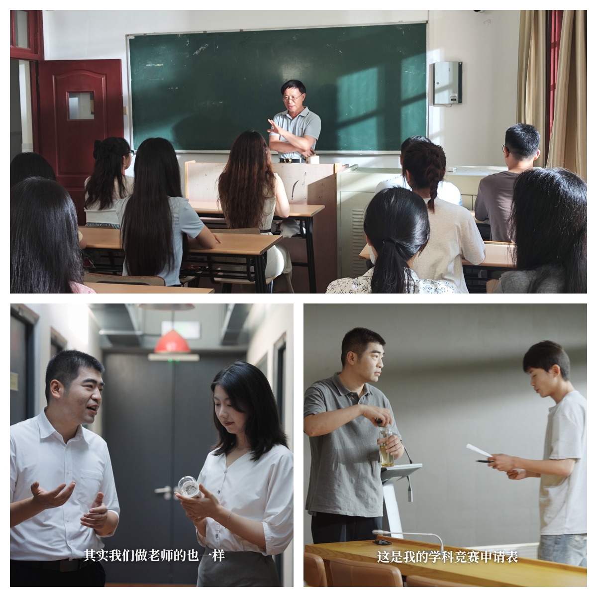 《何以为师》是一部以教育为核心题材,聚焦师道传承与自我追寻的短片。影片通过三段交织的叙事,探讨“老师”二字背后的深刻内涵。故事主线围绕我校青年教师代表傅毅老师对两位不同对象的访谈展开。面对在教学与科研压力中迷失方向的年轻教师,傅老师以“水”为喻,劝导她静心思考,帮助她重拾初心,坚定前行。而对于因就业压力动摇对专业学习热爱的大学生,傅老师则以“水随器而形”的理念启发他正视内心,鼓励他勇敢探索学科前沿,追寻心中理想。在访谈过程中,傅老师亦回忆起恩师张老师的教诲。这一精神代代相传,成为傅老师执教多年的信念支撑。