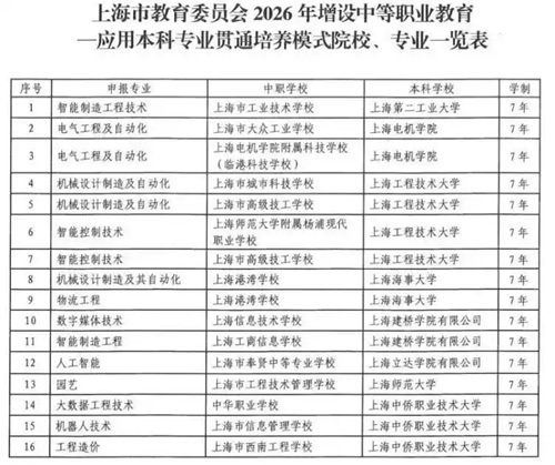 2026年,上海海事大学首次加入中本贯通培养行列,与上海港湾学校共同开设机械设计制造及其自动化、物流工程2个专业点;上海师范大学与上海市工程技术管理学校贯通开设园艺专业点;上海唯一的职业本科院校——上海中侨职业技术大学,此次增设大数据工程技术、工程造价、机器人技术3个中本贯通专业;上海第二工业大学、上海工程技术大学、上海电机学院3所公办院校均将与中职校共同开展职业本科的贯通培养。