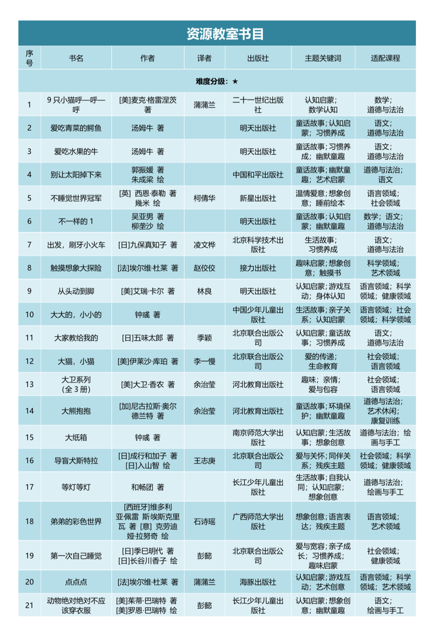 为资源教室推荐的500本图书主要针对义务教育阶段在普通幼儿园和中小学随班就读的各类学生,兼顾学前特殊儿童和高中高职阶段的特殊学生,从语言发展、认知发展、社会性发展、图画等四个维度综合评定图书的难度,对每本图书的难度进行标识。同时,为每本图书标注主题关键词、适配课程,从而帮助教师和家长较快选择符合儿童个性化需求的图书。如《菲菲生气了》《我的情绪小怪兽》《我变成一只喷火龙了》属于情绪管理主题;《胖国王》《不睡觉世界冠军》《慌张先生》《好脏的哈利》能够帮助学生养成良好的学习和生活习惯;《每一个善举》《南瓜汤》《青蛙和蟾蜍》能够改善学生同伴关系;《玛德琳和图书馆里的狗》《没有耳朵的兔子》《躲猫猫大王》《改变世界的六个点》等主题绘本可以成为融合教育宣导课的最好素材。