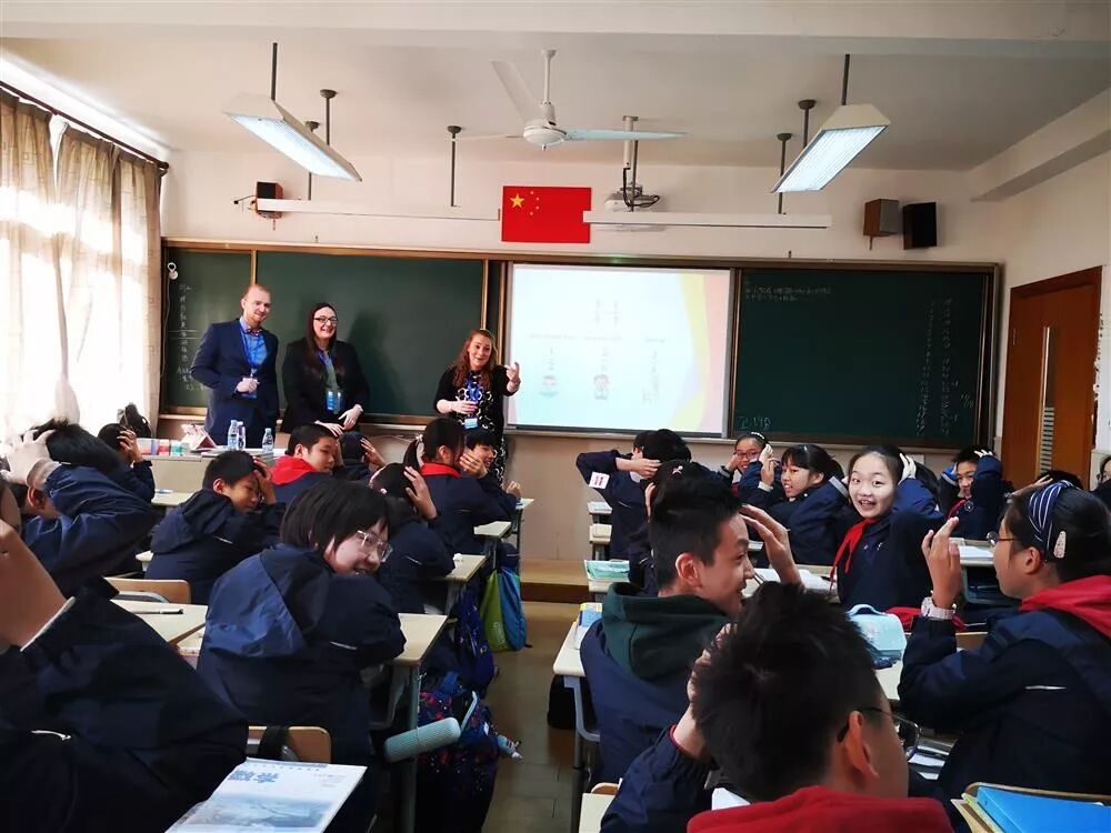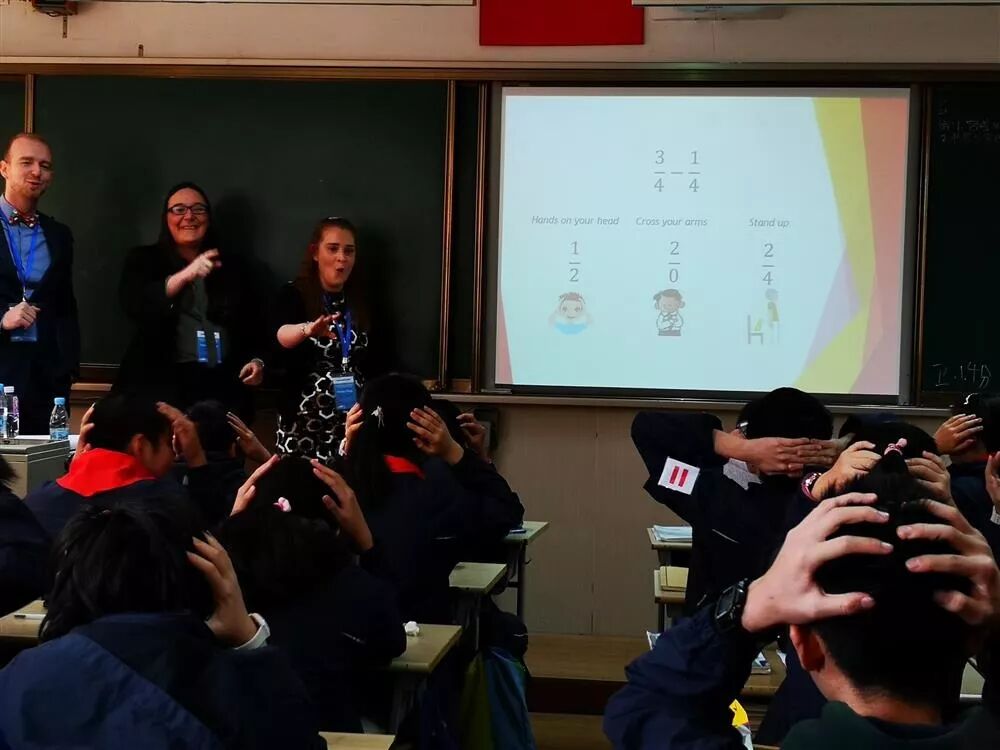 “英国老师的课,比较简单,但是很嗨……”这是静安区教育学院附属学校七年级学生,对英格兰数学老师们进校“代课”的主流评价。没错,那天上午的第三节课,海瑟、阿曼达、艾力克老师一起登上讲台,用一系列选择题“快闪”和“暖场”。不同于直接回答A、B或C选项,她们请全班学生分别用“抱头、叉臂或起立”同时作答,看看哪位的动作“与众不同”。欢笑中,肢体语言互动,课堂一时爆棚。