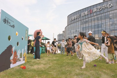 暑假期间,前滩31大草坪设置了浪浪山小妖怪主题打卡点,小朋友正在参与游戏互动。 本报记者 赖鑫琳 摄
