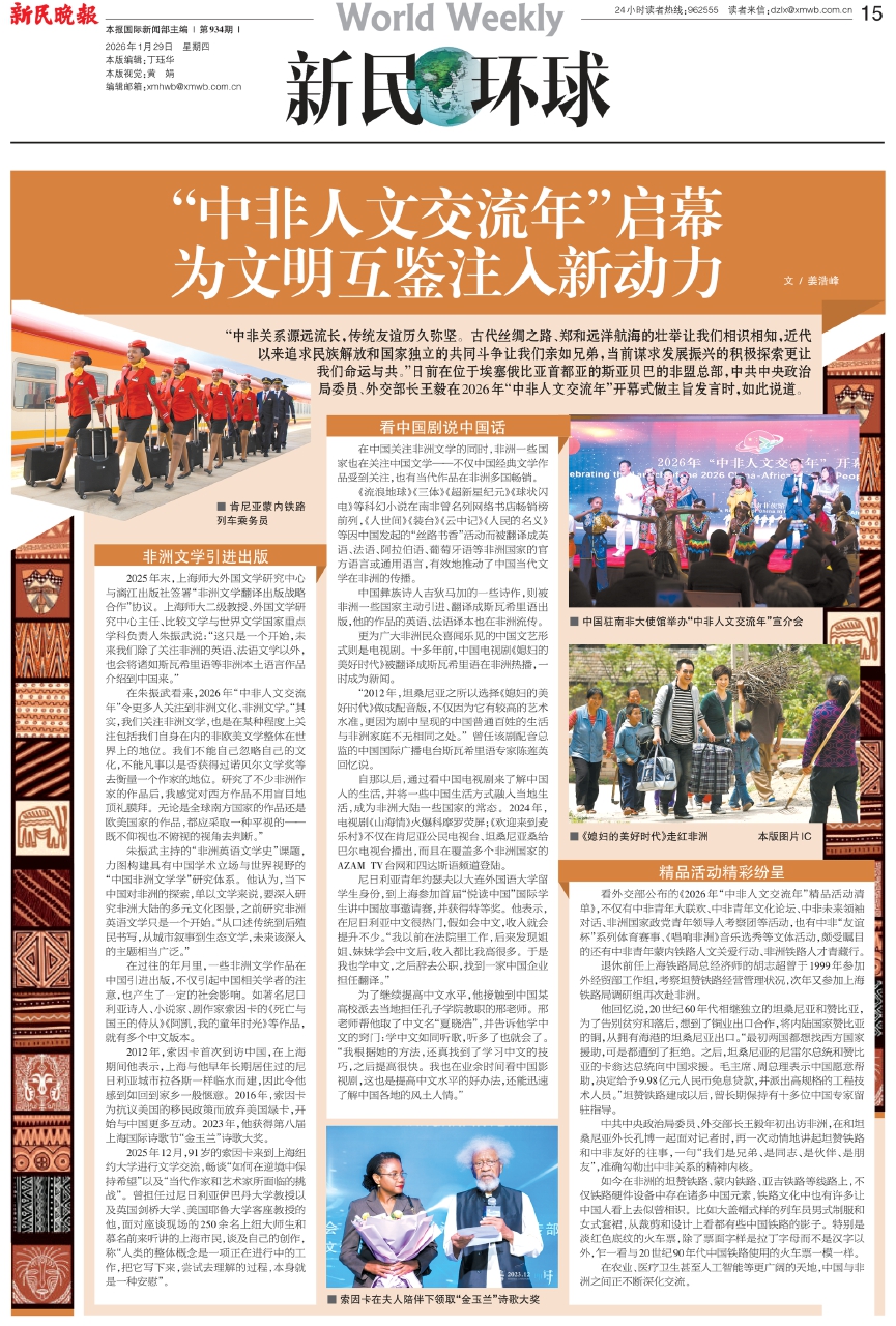 看外交部公布的《2026年“中非人文交流年”精品活动清单》,不仅有中非青年大联欢、中非青年文化论坛、中非未来领袖对话、非洲国家政党青年领导人考察团等活动,也有中非“友谊杯”系列体育赛事、《唱响非洲》音乐选秀等文体活动,颇受瞩目的还有中非青年蒙内铁路人文关爱行动、非洲铁路人才青藏行。