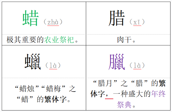 先秦时期有两个冬季狂欢祭典,分别叫“蜡(zhà)祭”和“腊(là)祭”。“蜡祭”之“蜡”与“腊祭”之“腊”在简化字中很容易混,但在繁体字系统里,“蜡”仍写作“蜡”,而“腊”则要写成“臘”,俩字看长相就没啥血缘关系。