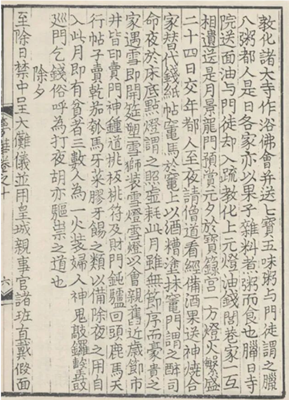 所以,在汉传佛教中,十二月初八是一个非常值得纪念的日子。纪念的方式呢,一开始主要是擦洗佛造像(称为“浴佛”,汉传佛教中另一个主要的浴佛日是四月初八“佛诞日”,它也是一个“八日”),以及信众自己洗澡(以图洗掉罪孽,它正好与腊除中的祛邪风俗相似);发展到宋代,则出现了盛大的斋会。孟元老《东京梦华录》记载北宋的十二月初八日:“诸大寺作浴佛会,并送七宝五味粥与门徒,谓之‘腊八粥’。都人是日各家亦以果子、杂料煮粥而食也。”