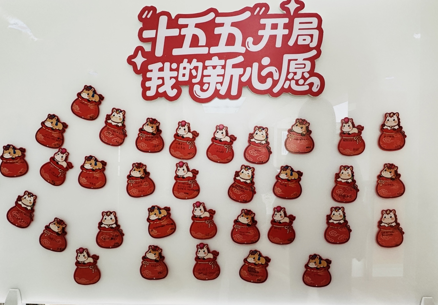 上周五刚刚告别一个学期的喧闹,华东政法大学附属中学的校园今天一早又热闹起来。通往2楼模拟政协厅的楼梯围栏上,贴上了喜气洋洋的新春贴纸。一张张笔迹稚拙的心愿卡透出卡片背后的好心情,也说出了对未来的期待(下图)。
