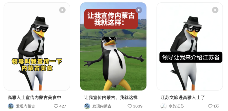 不少文旅官方账号“下场”,让高雅企鹅跳着魔性舞蹈介绍当地美景