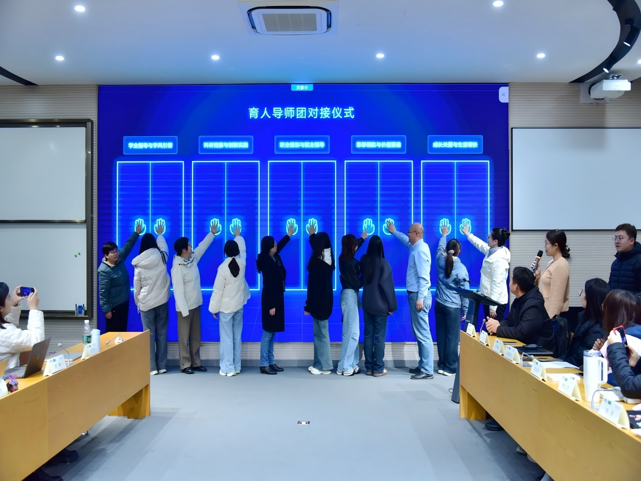 活动现场,五大导师团团长和学生班委联络员共同开启成长对接之门,各团长分别介绍细致的工作计划和务实的育人举措。