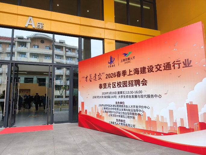 3月20日下午,“才荟建交”2026年春季上海建设交通行业奉贤片区校园招聘会在我校奉贤校区大学生综合发展与现代服务中心顺利举行。本次招聘会由上海市住建委人才中心、上海师范大学学生职业发展与就业指导中心、上海应用技术大学就业创业指导服务中心与我校建筑工程学院联合主办,旨在为高校学生与建设交通行业优质企业搭建高效、精准的供需对接平台,助力毕业生更充分、更高质量就业。