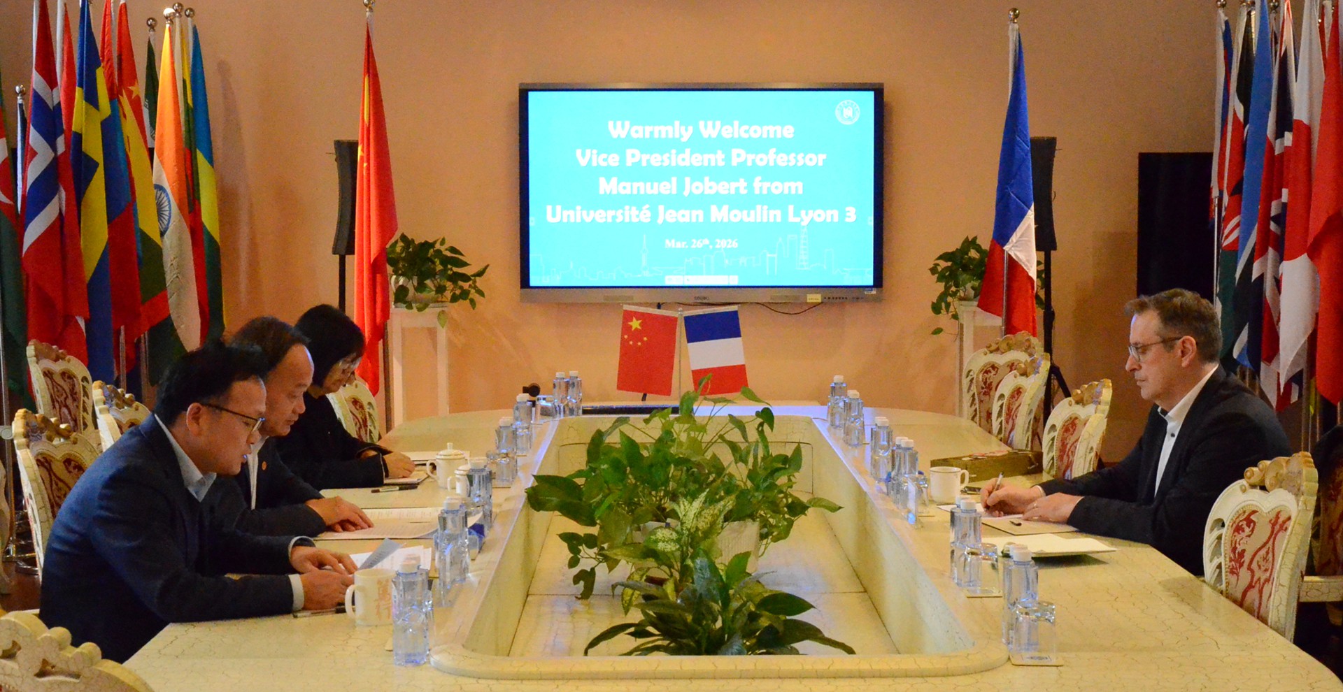 3月26日下午,法国里昂第三大学副校长曼努埃尔·若贝尔(Manuel Jobert)到访我校。我校党委书记林在勇、副校长蒋明军会见客人,人文学院、国际交流处负责人及相关教师代表出席会谈。