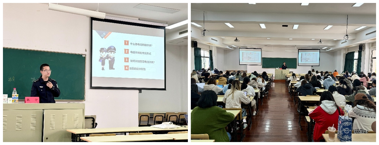 讲座中,张宁结合真实案例,围绕防范电信网络诈骗、校园安全、无人机黑飞等常见风险点进行了系统讲解。通过剖析典型骗局,张宁将原本抽象的安全知识转化为具体可行的电信诈骗防范要点,帮助同学们认识到:风险就在身边,防范刻不容缓。随后,在校园道路交通安全、消防安全方面,他提醒全体师生须摒弃侥幸心理,自觉遵守交通规范,敲响消防安全警钟。