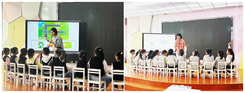揭牌仪式的第一环节是临潮幼儿园教师裴叶、陈怡隽展示的以教育机器人为载体的大班集体活动,他们带领幼儿利用计算思维帮助小机器人解决在旅游线路设计和上小学过程中可能遇到的问题,感受祖国风光和民族文化,学习交通规则,培养幼儿爱国情怀和逻辑思考能力,激发幼儿探索求知欲。