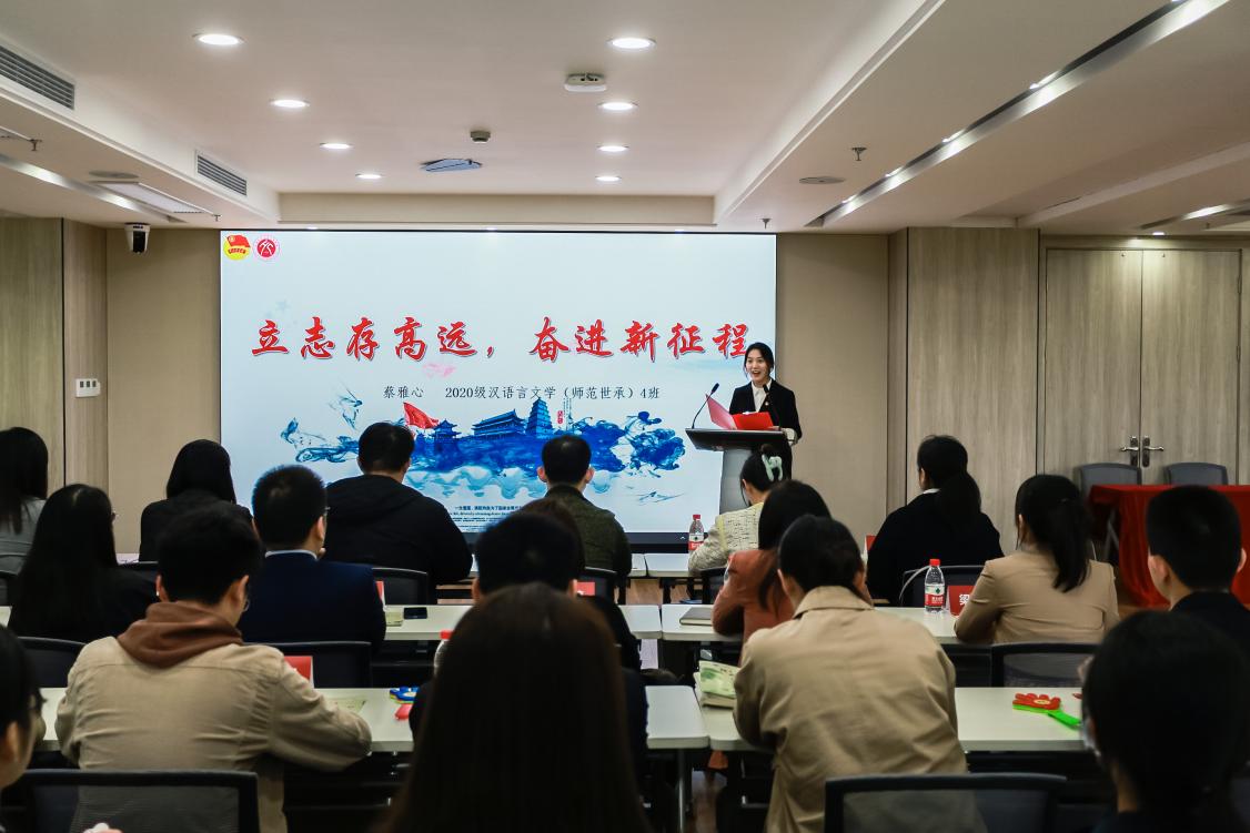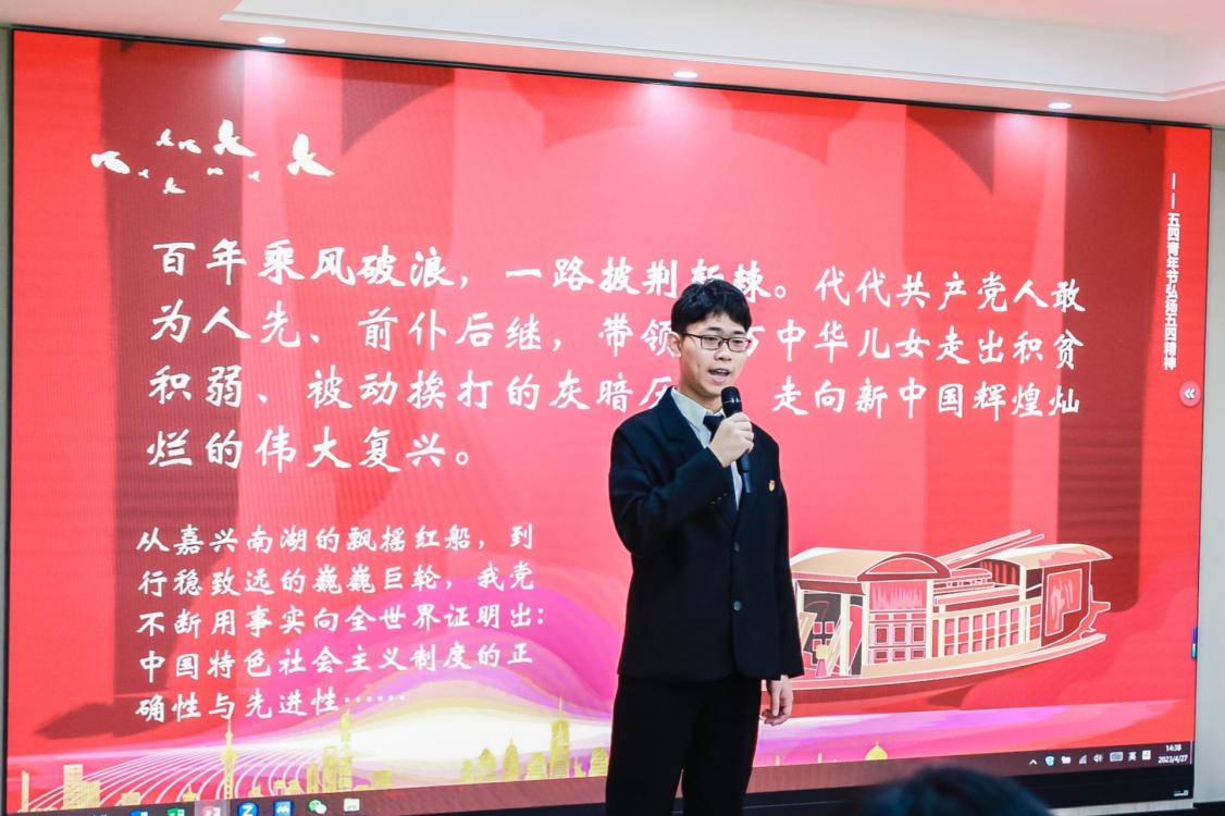 人文学院领航理论宣讲团成员、2020级汉语言文学(师范世承)专业的蔡雅心作《立志存高远,奋进新征程》主题分享,号召同学们坚定青春理想,把“小我”融入祖国发展的“大我”;人文学院学生会执行主席郁辰昊和学生会主席团成员范陈昕朗诵原创诗歌《正青春》,歌颂伟大祖国,展现青春力量;学院首届“朝阳杯”五四主题演讲比赛一等奖获得者、2022级古典文献学专业的武鸿宇同学作《五四浪潮翻涌,吾辈再创辉煌》激情演讲,表达出吾辈青年以奋斗之姿激扬青春、挺膺担当的坚定信念。