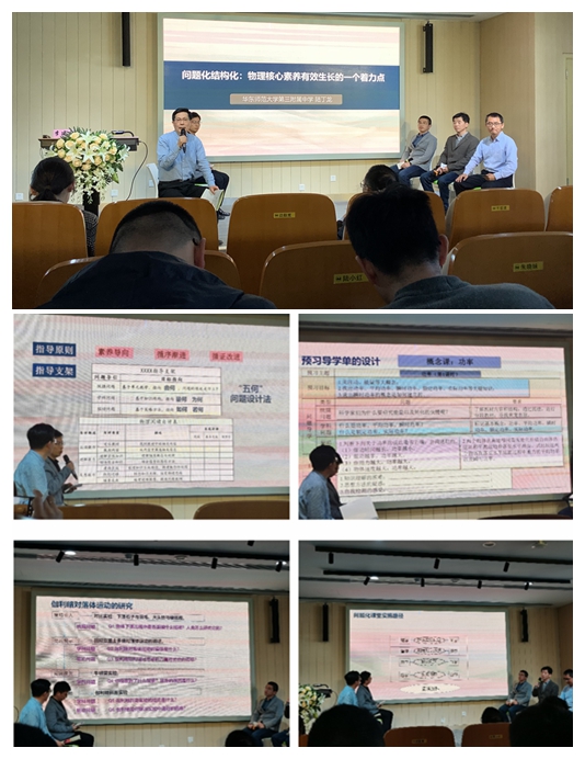 来自中学教学一线的五位优秀物理教师上台分享了对问题化教学的研究成果和心得,围绕问题化结构化、问题化教学的基础、支架、实施、改进等方面进行了具体的分析。例如,提出了从“寻脉问道”到“搭建支架”“课堂实践”再到“打造闭环”的推进路径,针对如何提升物理阅读能力、设计预习导学单、催生素养的有效生长、设计作业反刍单等进行了详细的阐述和讲解等。