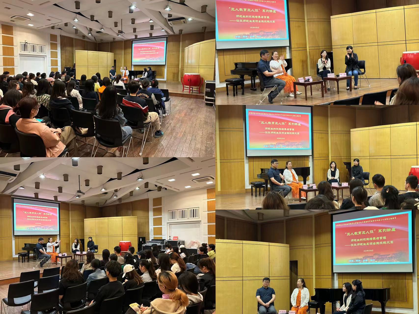 5月6日下午,音乐学院学习贯彻习近平新时代中国特色社会主义思想主题教育之“三全育人三人谈”系列沙龙在小音乐厅举行。学院声乐系副主任郭娉婷副教授、教师教育部主任李嘉栋副教授、学院2013届毕业生、曾荣获教育部体育卫生与艺术教育司主办的“全国普通高等学校音乐学(师范类)专业本科学生基本功比赛”个人全能一等奖、汇师小学音乐老师胡君瑜等三位教师围绕“师范生技能培养与掌握——师范生五项全能技能大赛”与学生进行了专题交流。