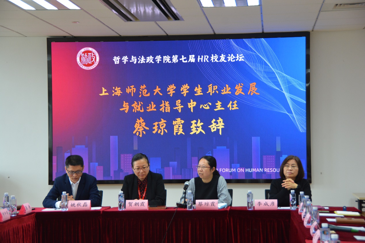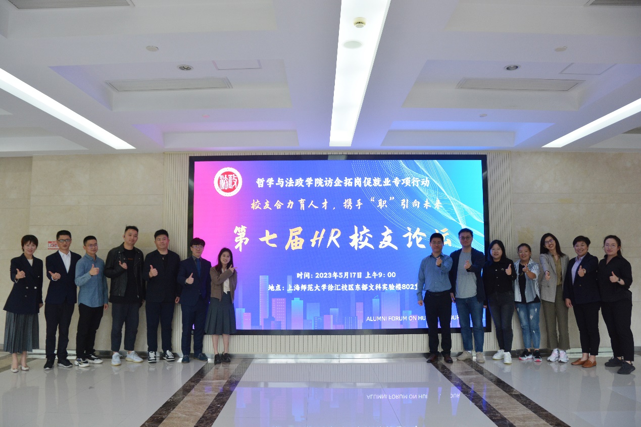 5月17日上午,哲学与法政学院访企拓岗专项行动之第七届HR校友论坛于徐汇校区文科实验楼802会议室举行。哲学与法政学院党委书记贺朝霞,上海师范大学职业发展与就业指导中心主任蔡琼霞,哲学与法政学院人力资源管理系主任李成彦等出席本次会议。会议由哲学与法政学院党委副书记、副院长姚秋磊主持。学院2007届人资校友右享(上海)管理咨询有限公司人力资源总裁何中伟、2010届人资校友凯西医药咨询(上海)有限公司高级薪酬福利经理顾宇昺等11位HR校友代表、上海申爱社会工作发展中心总干事周星等3位企业嘉宾以及哲学与法政学院人力资源管理系教师代表到场交流,哲学与法政学院40余名本研学生共同参与。